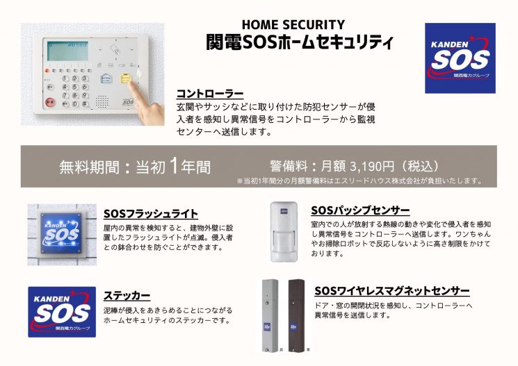 また、外観・窓際などにはSOSのステッカーを貼りセキュリティ完備をアピール。空き巣などの侵入の抑止力を高めます。