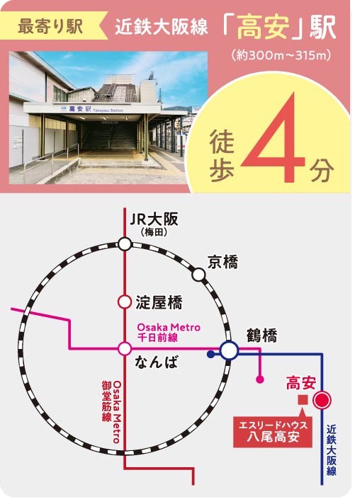 - 近鉄大阪線「高安」駅徒歩5分(約315m)