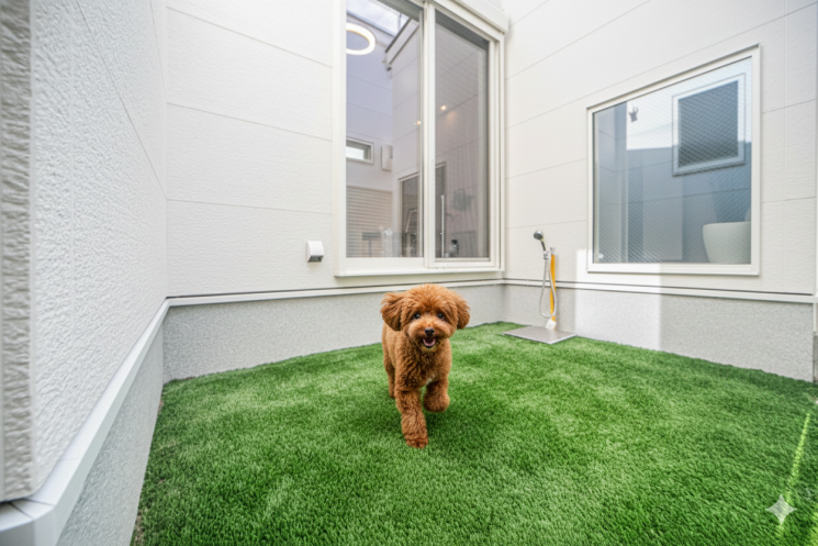 天然素材の充填材「寒土-KANDO®-」を使用しており、天然芝に極限まで近い環境を実現しています。人肌や犬ちゃんにも優しい人工芝です。※現地写真(2025年11月撮影)